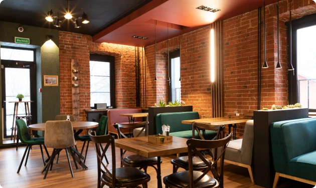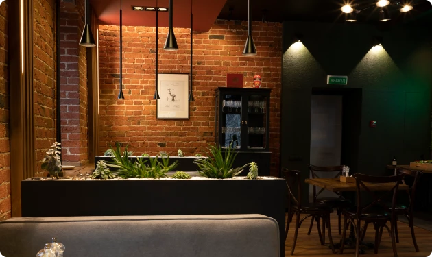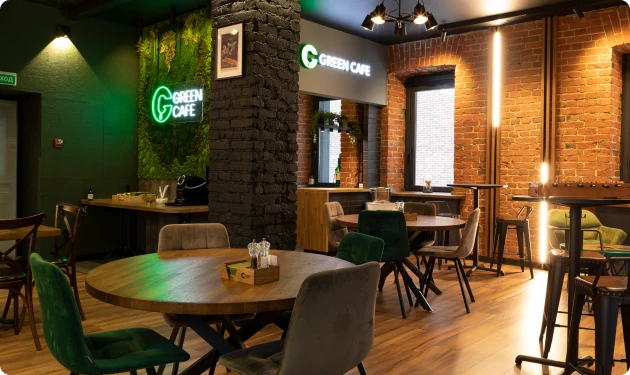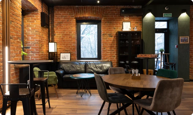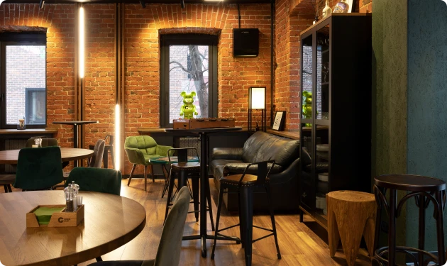 Чтобы отвлечься от учебного процесса и комфортно провести кофе-брейки, обеды или просто пообщаться с коллегами, в нашем здании есть собственное кафе в стиле лофт. Приятная атмосфера, стильный дизайн и всё, что необходимо для уютного времяпрепровождения.
