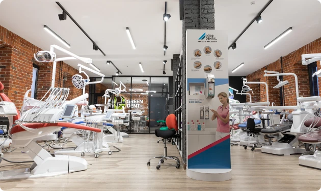 Наш шоурум имеет очень удобное расположение и транспортную доступность. В нём расположено более 60 единиц всех видов стоматологического оборудования. Ежегодно выставочный зал посещают около 2000 врачей-стоматологов и владельцев стоматологических клиник.