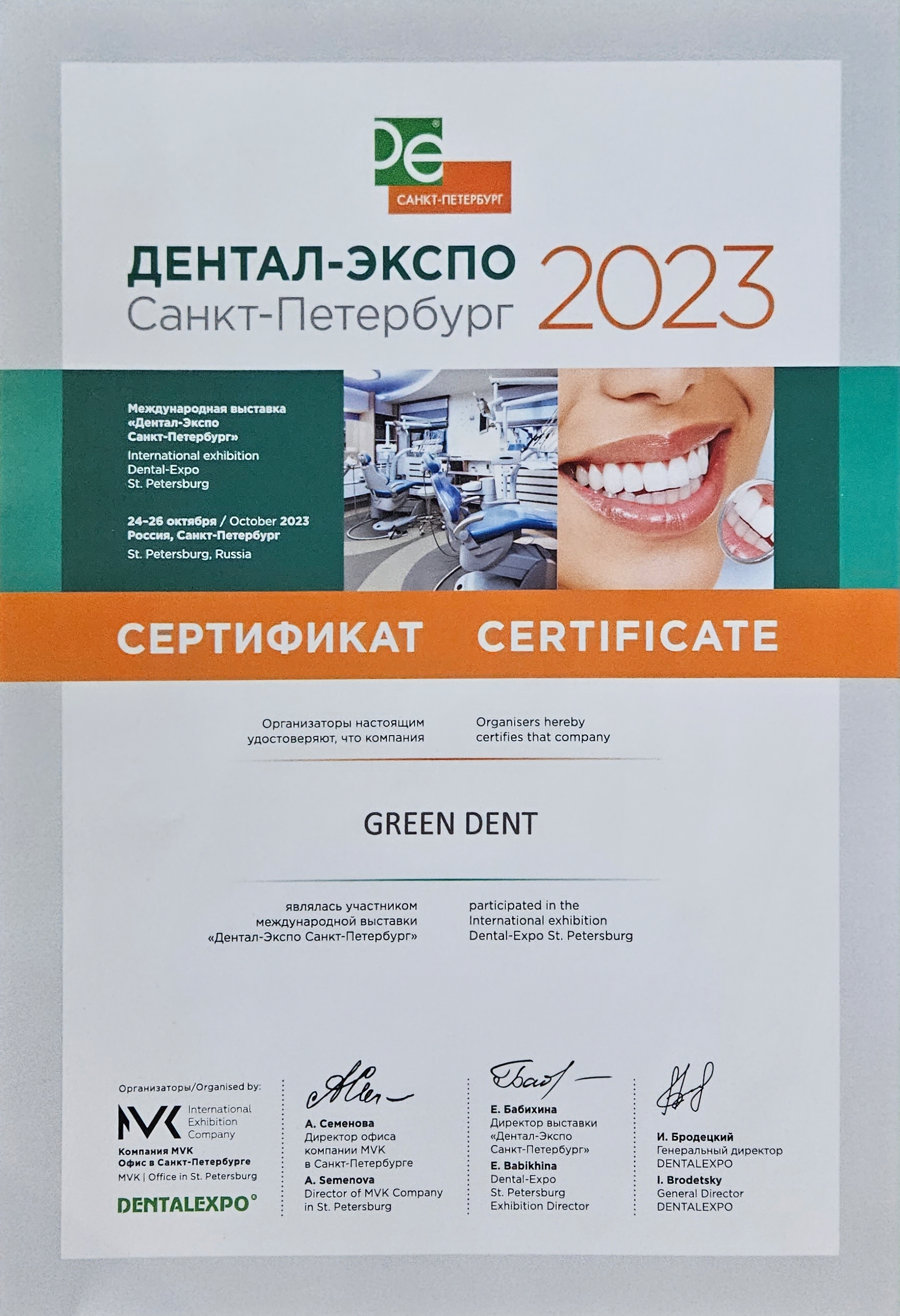 Организаторы настоящим удостоверяют, что компания GREEN DENT являлась участником международной выставки «Дентал-Экспо Санкт-Петербург»