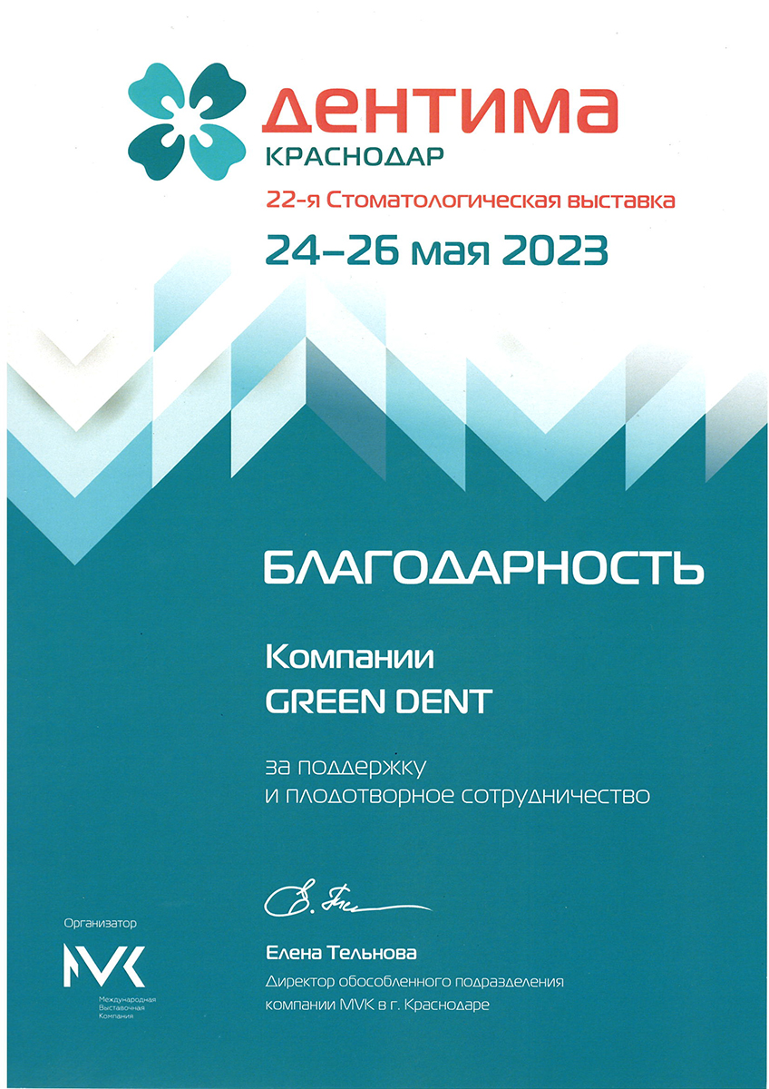 Компания MVK настоящим удостоверяет, что компания GREEN DENT являлась участником выставки «Дентима Краснодар» и была удостоена высокой оценки организатора за актуальность и профессионализм представленной экспозиции.
